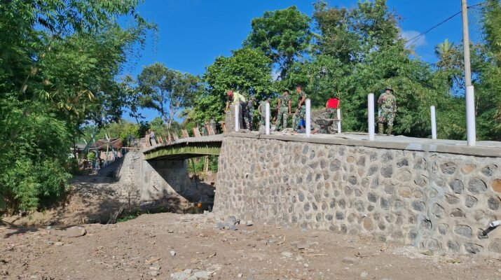 BANYUWANGI – Pembangunan jembatan dalam program TNI Manunggal Membangun Desa (TMMD) ke-125 Kodim 0825 Banyuwangi terus menunjukkan progres signifikan. Hingga hari ini, pengerjaan telah memasuki tahap penyelesaian konstruksi, termasuk pemasangan dinding pembatas dan perapian permukaan jembatan.