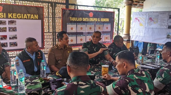 Lumajang, Komitmen TNI dalam hadir untuk rakyat kembali tampak saat Pangdam V/Brawijaya, Mayjen TNI Rudi Saladin, turun langsung meninjau kondisi terkini wilayah terdampak erupsi Gunung Semeru. Didampingi Danrem 083/Baladhika Jaya Kolonel Inf Kohir serta jajaran Forkopimda Lumajang, Pangdam meninjau Posko Tanggap Darurat Bencana di Desa Supiturang, Kecamatan Pronojiwo, Kabupaten Lumajang, Jawa Timur. pada Senin (24/11/2025).