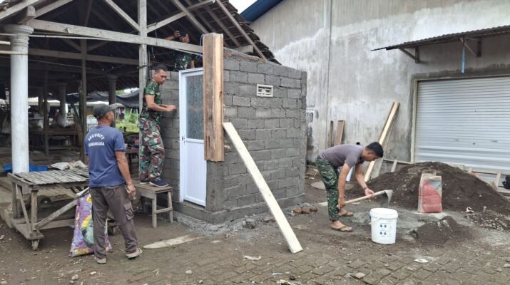 Banyuwangi – Satgas TNI Manunggal Membangun Desa (TMMD) ke-125 Kodim 0825/Banyuwangi membangun fasilitas mandi, cuci, kakus (MCK) di pasar tradisional wilayah Kecamatan Siliragung, Kabupaten Banyuwangi. Pembangunan ini menjadi salah satu sasaran tambahan (Sas TMMD) yang bertujuan meningkatkan fasilitas umum bagi masyarakat.