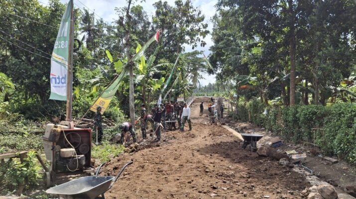 Di bawah rindangnya pepohonan dan teriknya matahari pagi, para prajurit TNI dan warga tampak tanpa lelah mengaduk tanah, mengangkat batu, dan menyusun material untuk mempercepat proses pembangunan jembatan. Pembangunan ini menjadi bagian penting dari sasaran fisik TMMD yang bertujuan meningkatkan konektivitas antar wilayah pedesaan serta memperlancar akses ekonomi dan sosial warga.