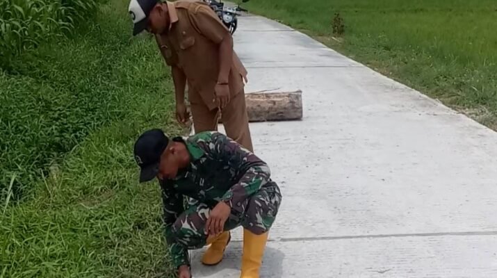 Anggota Satuan Tugas (Satgas) TMMD, Sertu Farid, bersama Kepala Dusun Sukomaju, Desa Lebakharjo, Kecamatan Ampelgading, meninjau langsung hasil pekerjaan jalan rabat beton yang telah selesai 100 persen.